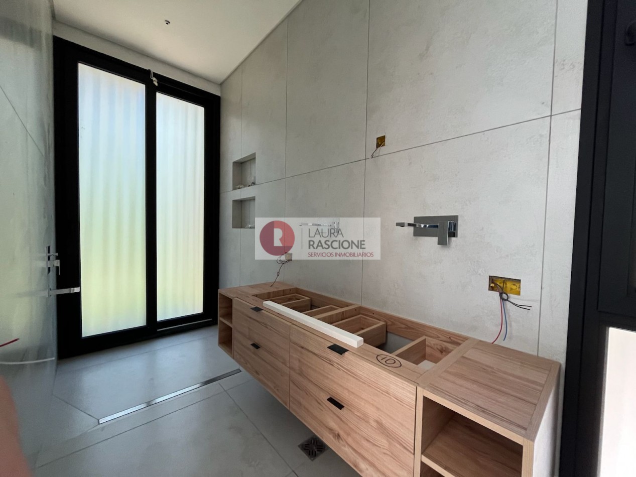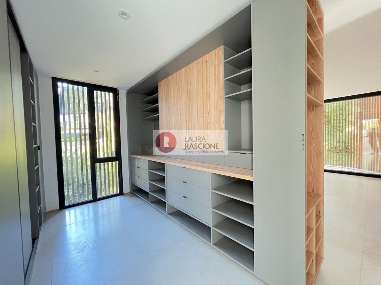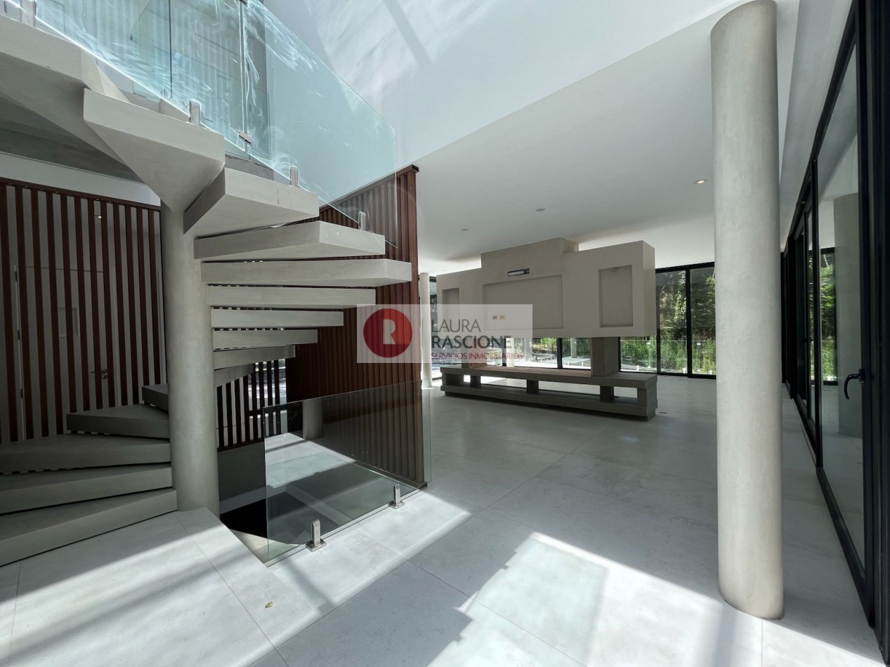 La casa se desarrolla en 3 niveles (Subsuelo, Planta baja y Planta Alta) los cuales se conectan mediante una escalera tipo espiral y ascensor. Se disponen así en el nivel inferior espacios de servicio como son el amplio lavadero y un dormitorio de huéspedes en suite con vestidor incluido; también cuenta con una gran cochera pensada para aparcar 3 vehículos y múltiples espacios de ocio con sauna, hidromasajes, playroom y gimnasio.