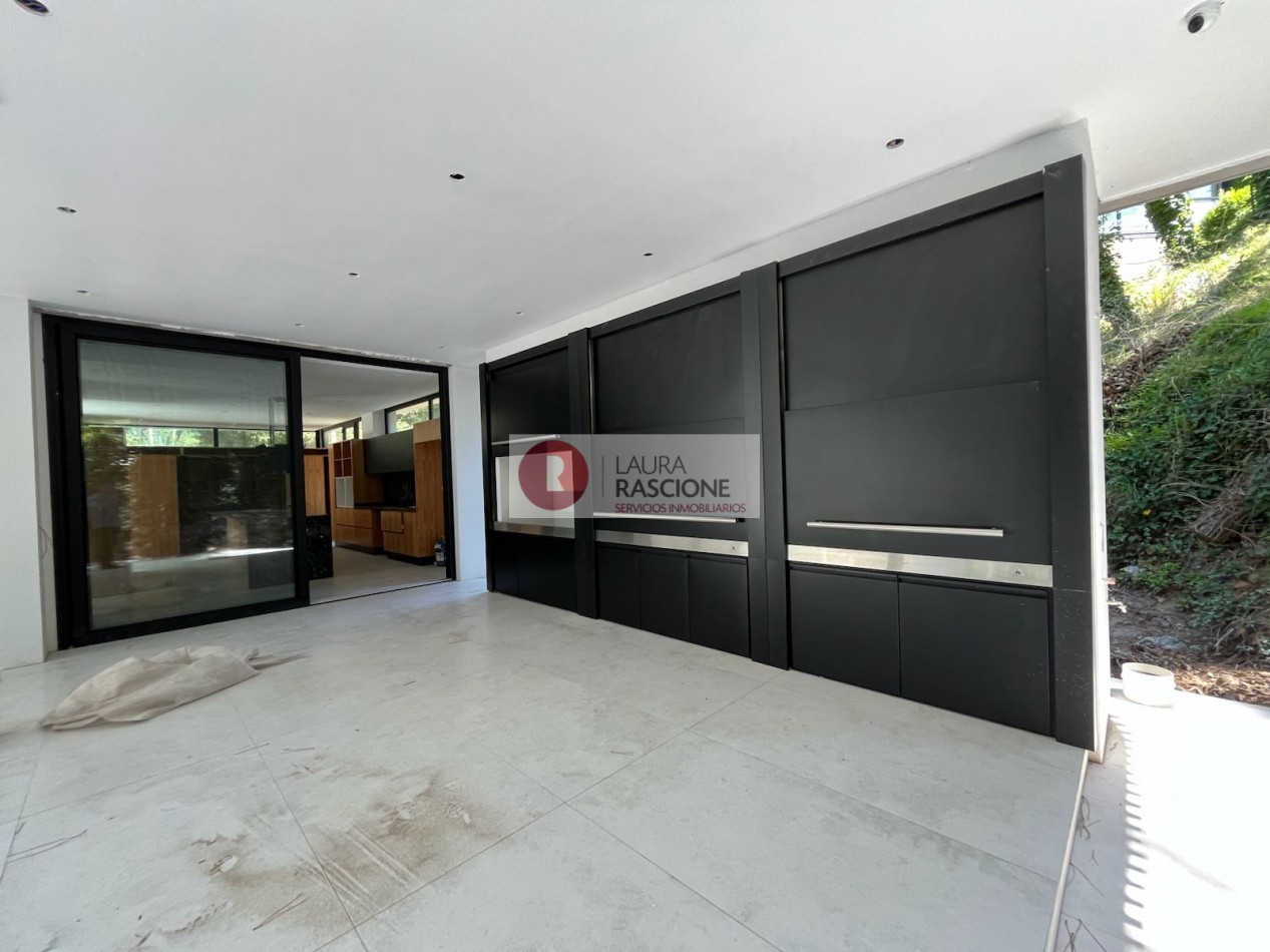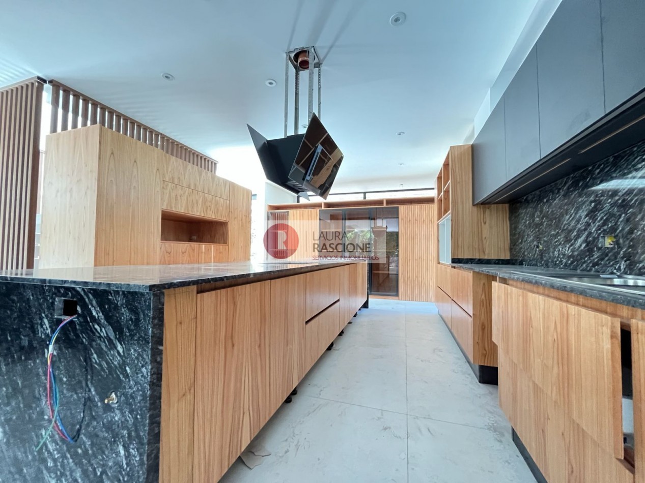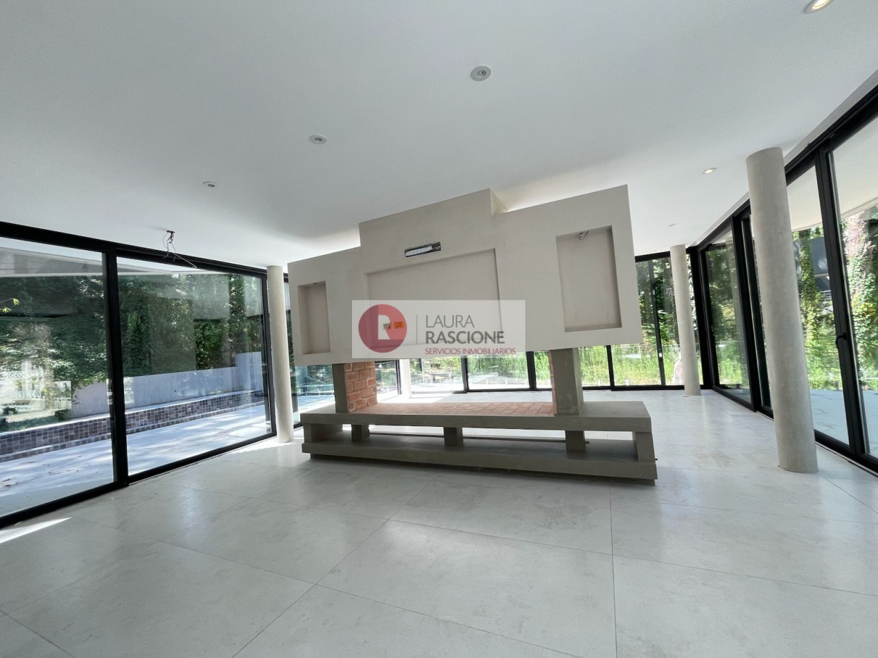El nivel Planta baja se presenta como una planta abierta, permeable con diferentes situaciones de expansión e integración con el entorno inmediato; la misma cuenta con una gran cocina equipada con una vinoteca, almacén lacena e isla/ barra la cual se integra con el sector de parrilla exterior; por otra parte, se encuentra comedor y estar los cuales se encuentran enmarcados dentro del mismo ambiente, pero separados por una gran estufa hogar de dos frentes. También en dicho nivel se pueden apreciar expansiones y situaciones de balconeo en el frente y en el contra frente en el sector de la pileta exterior.