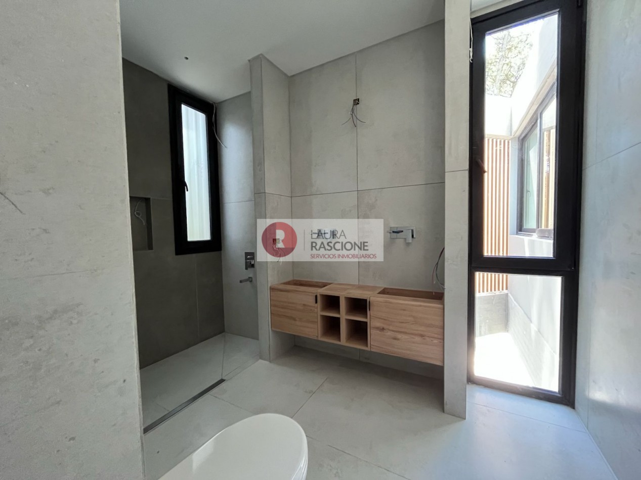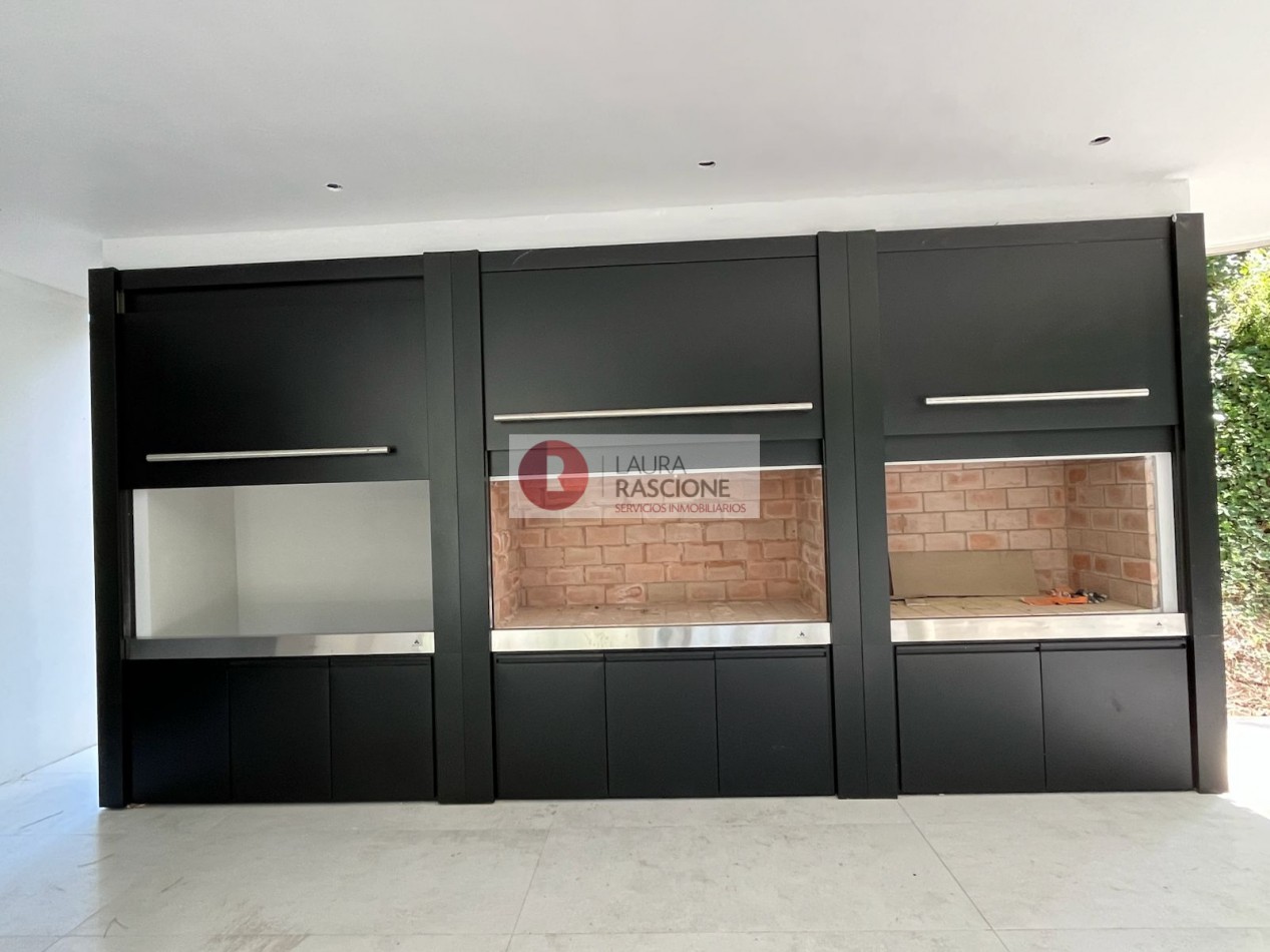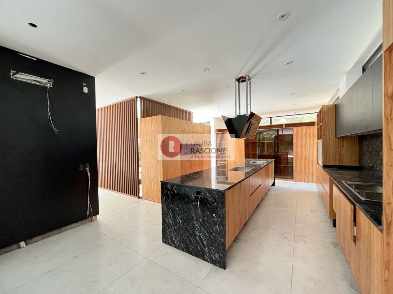 El nivel Planta baja se presenta como una planta abierta, permeable con diferentes situaciones de expansión e integración con el entorno inmediato; la misma cuenta con una gran cocina equipada con una vinoteca, almacén lacena e isla/ barra la cual se integra con el sector de parrilla exterior; por otra parte, se encuentra comedor y estar los cuales se encuentran enmarcados dentro del mismo ambiente, pero separados por una gran estufa hogar de dos frentes. También en dicho nivel se pueden apreciar expansiones y situaciones de balconeo en el frente y en el contra frente en el sector de la pileta exterior.