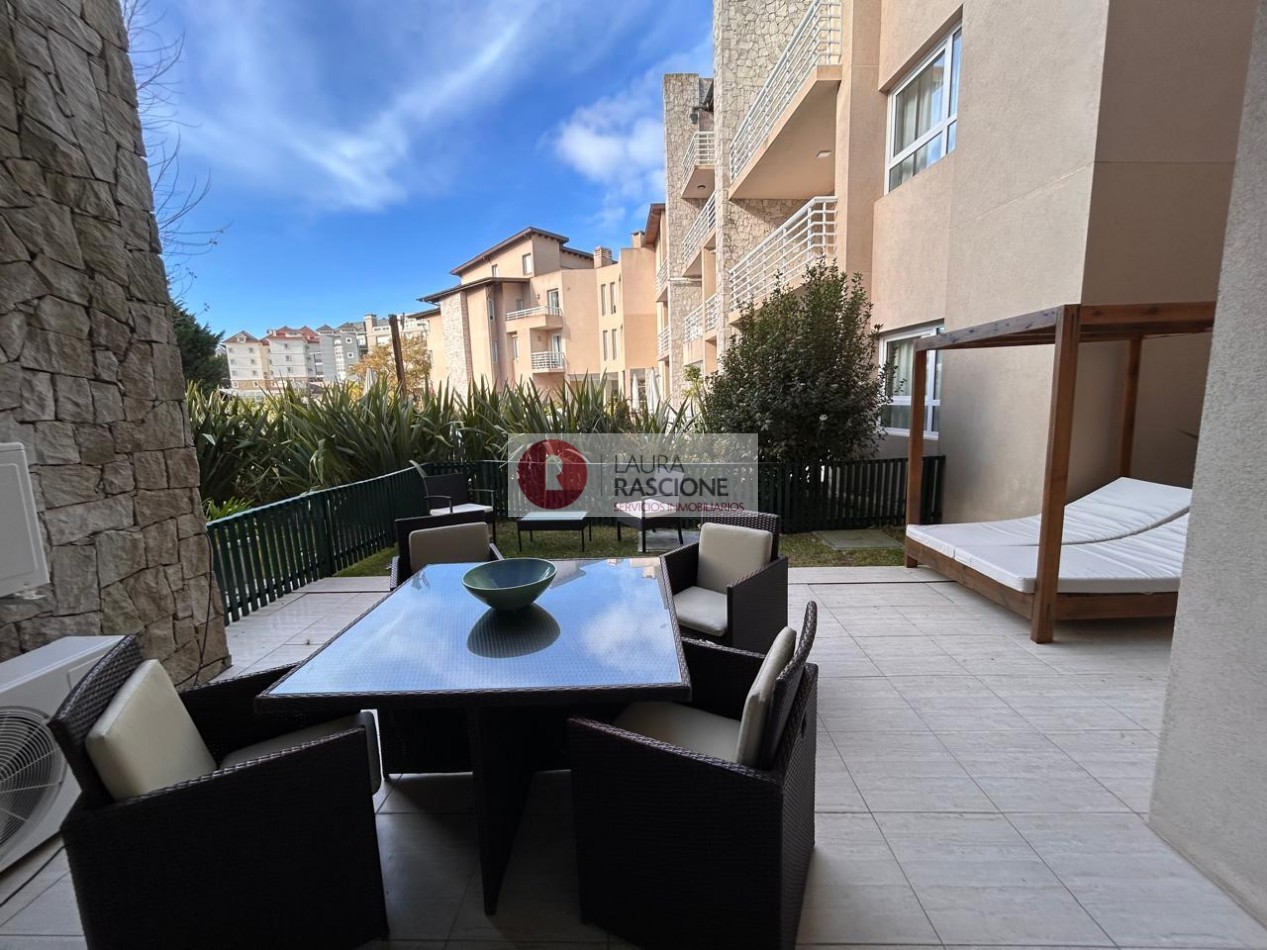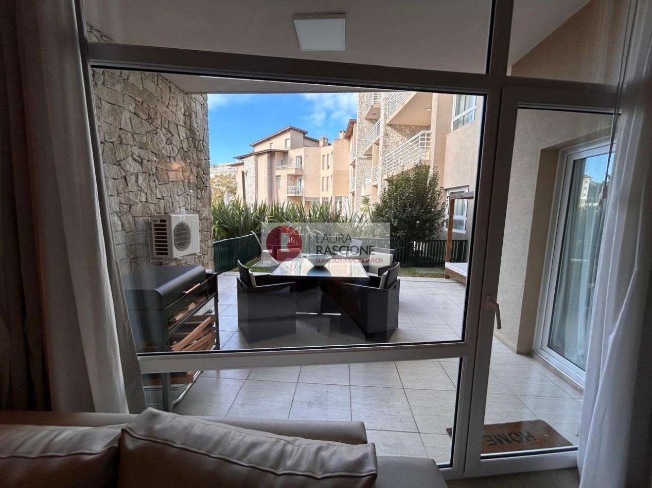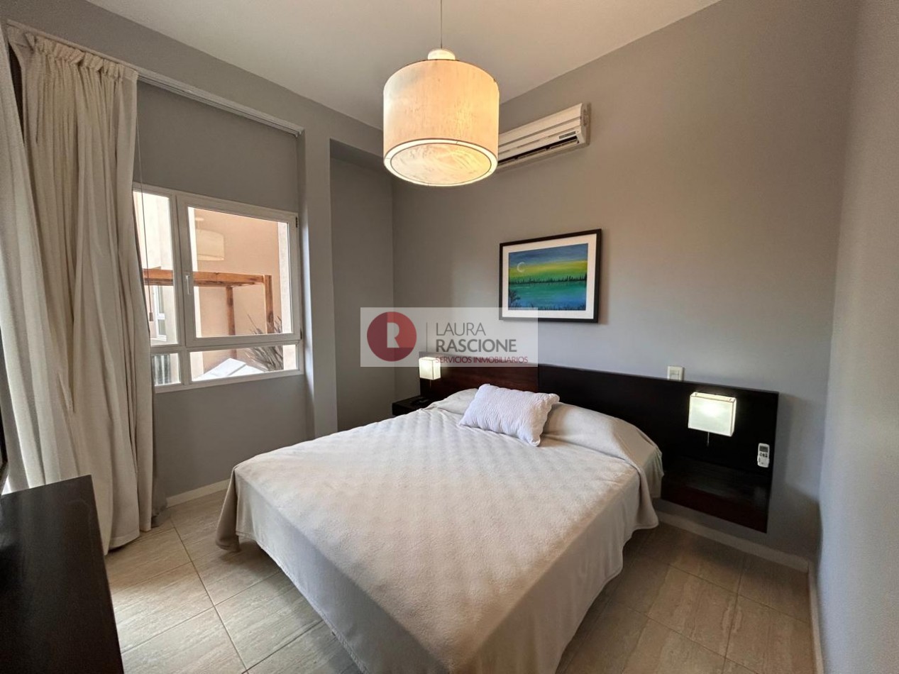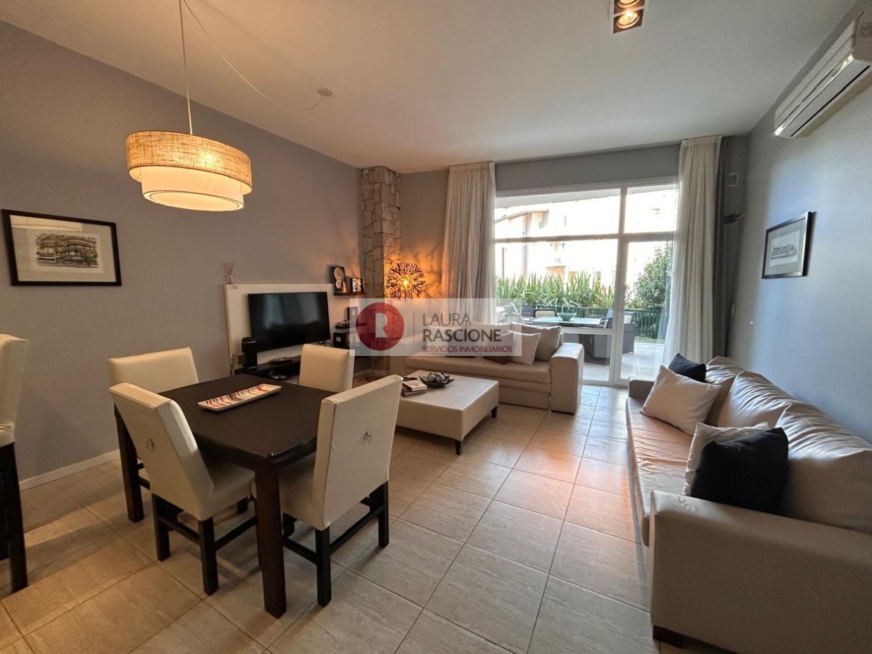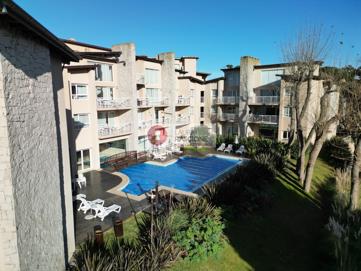 Departamento de 2 ambientes, con techos de gran altura, luminoso. Cuenta con amplio living comedor con barra desayunadora. Patio trasero hacia la piscina climatizada In OUT