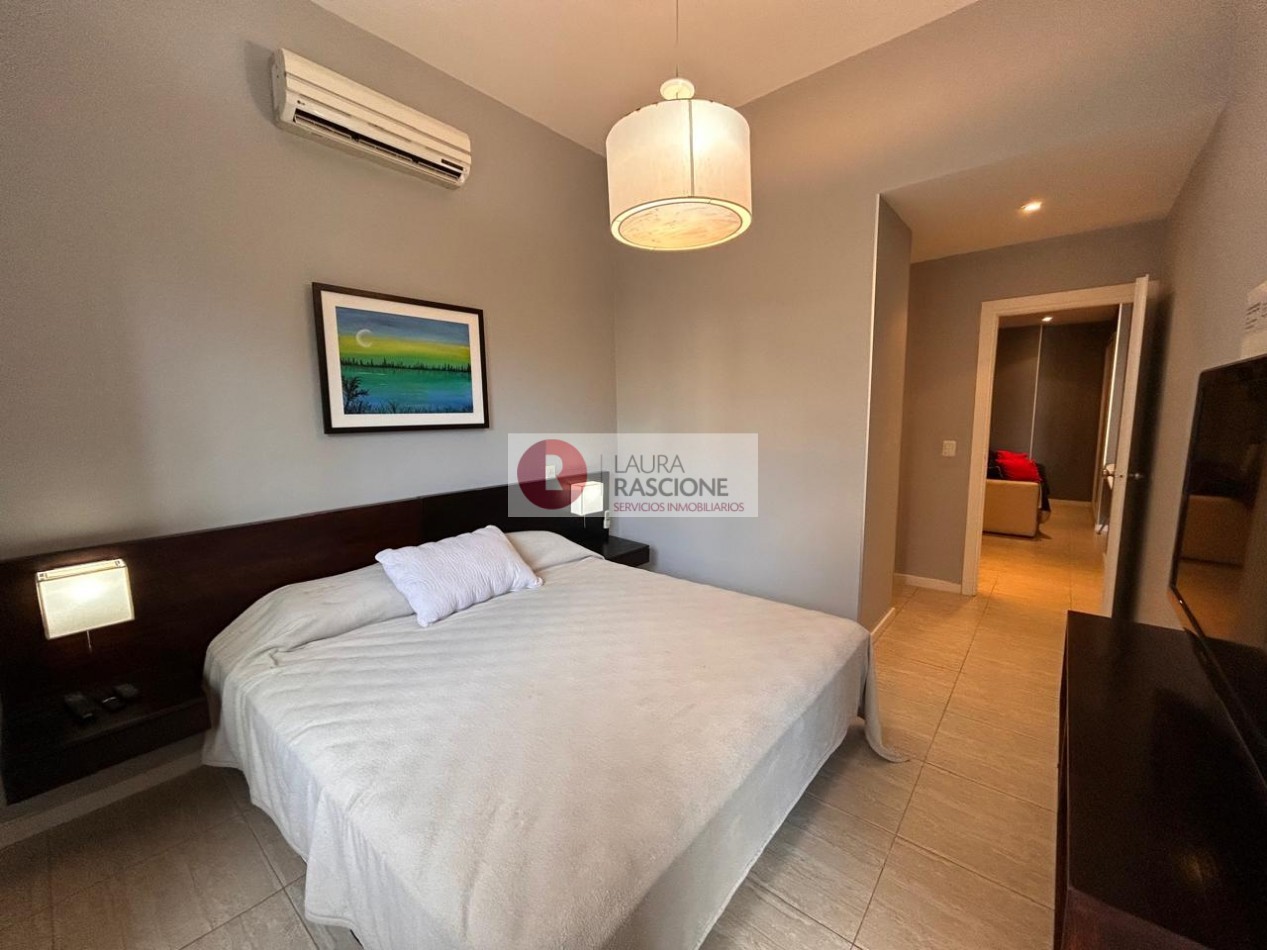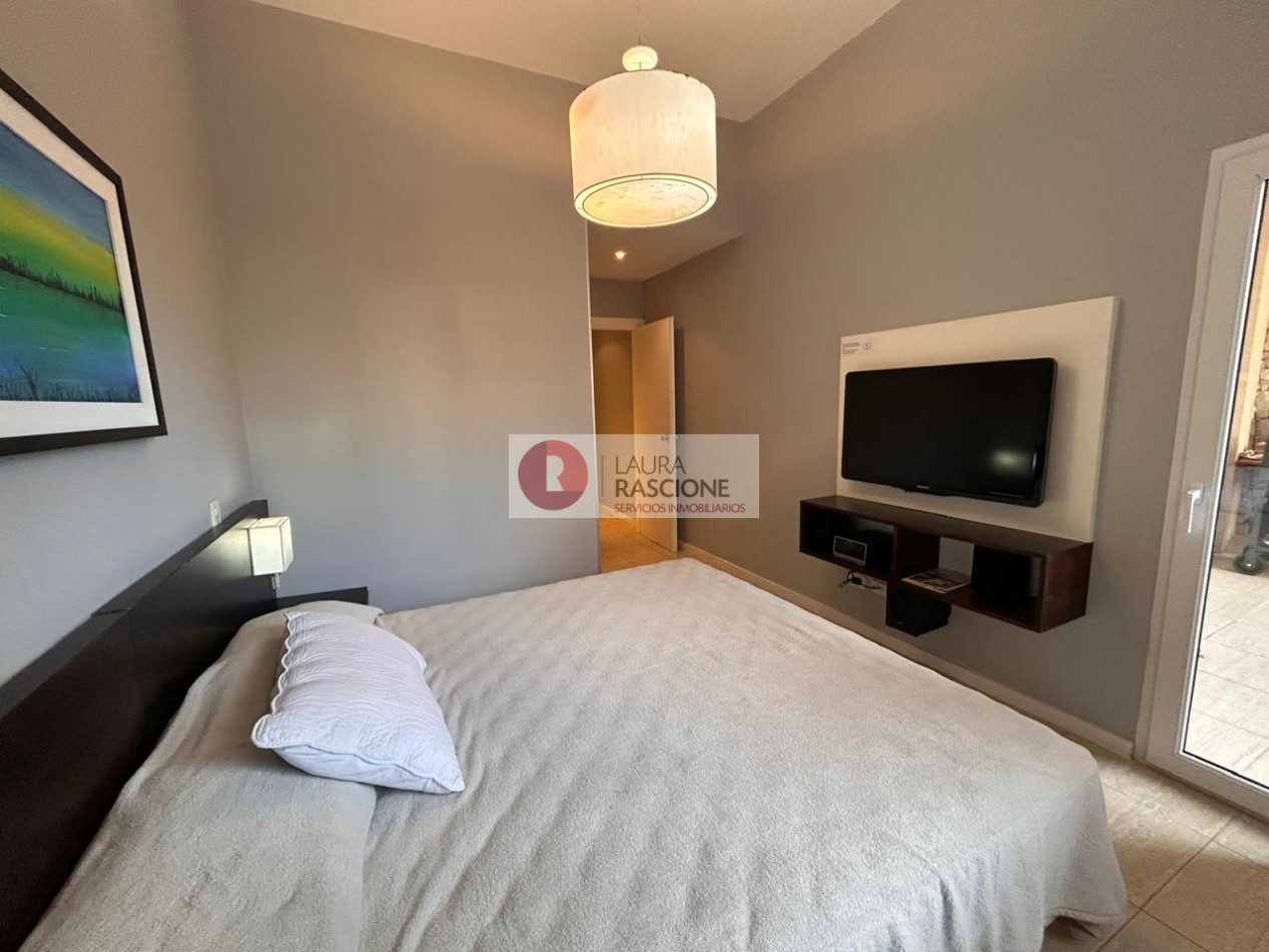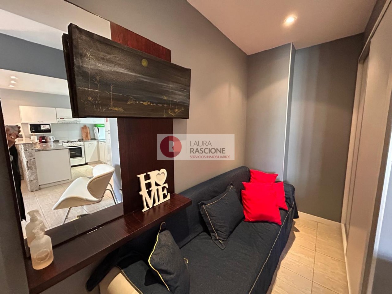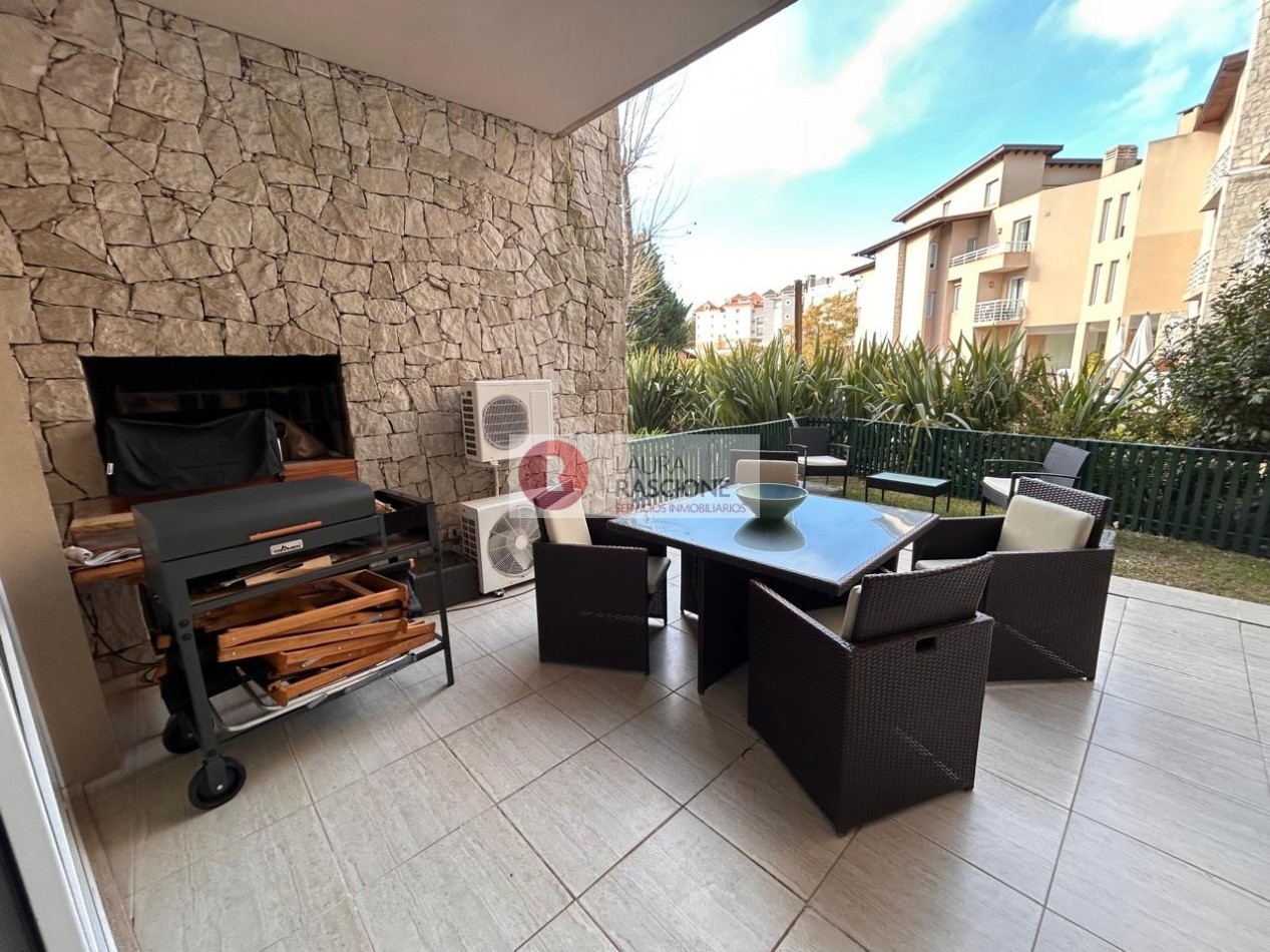 Departamento de 2 ambientes, con techos de gran altura, luminoso. Cuenta con amplio living comedor con barra desayunadora. Patio trasero hacia la piscina climatizada In OUT