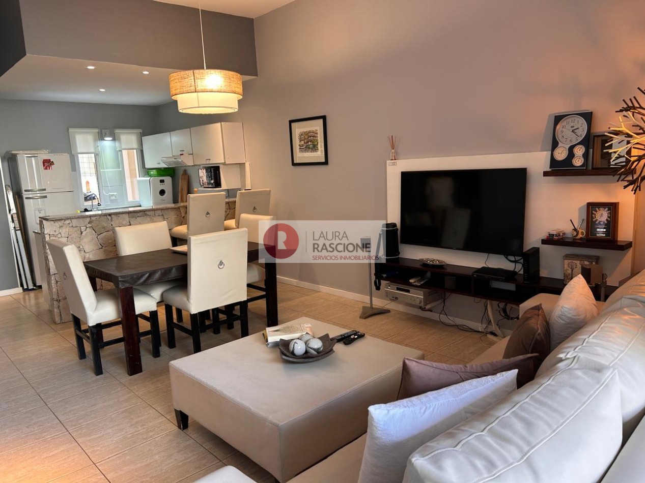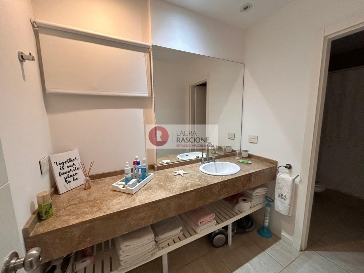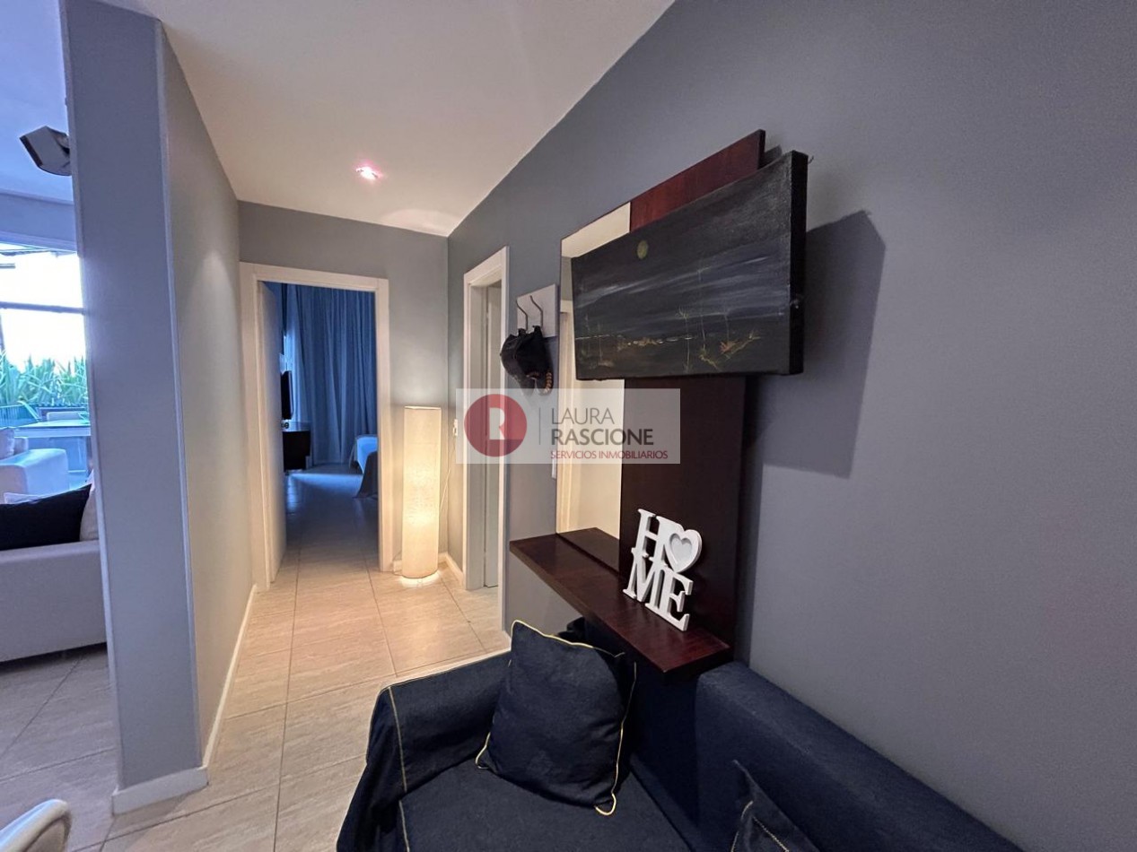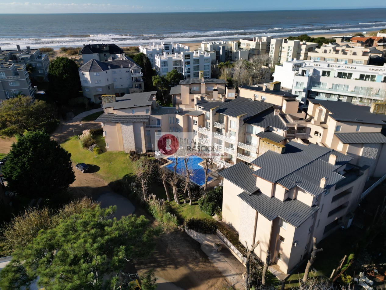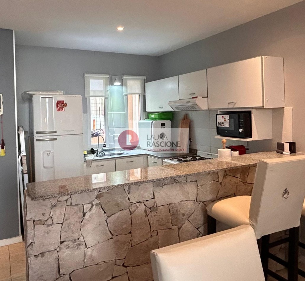 Departamento de 2 ambientes, con techos de gran altura, luminoso. Cuenta con amplio living comedor con barra desayunadora. Patio trasero hacia la piscina climatizada In OUT